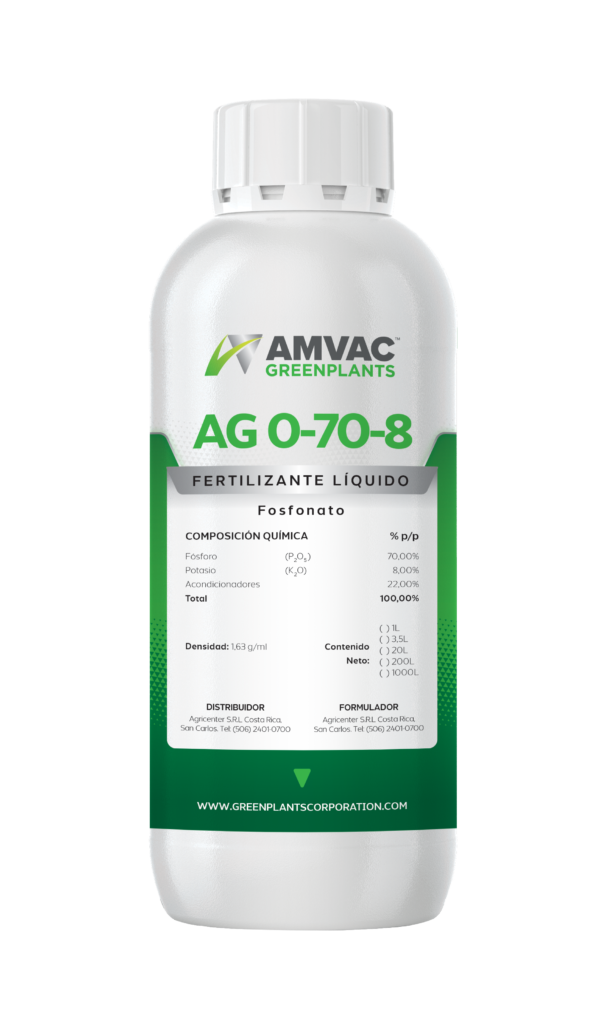 Riego localizado: Debido al perfecto equilibrio del AG 0-70-8, este penetra sin necesidad de emplear energizantes. Se recomienda en el cultivo de piña, banano, tomate, berenjena, repollo, coliflor, etc.