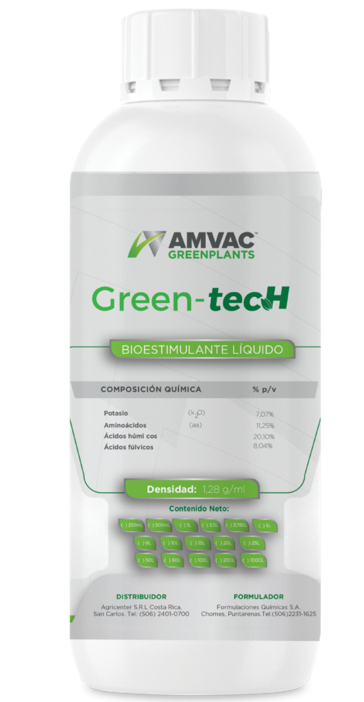 aminoácidos, rico en compuestos naturales que ayudan a promover el crecimiento de las plantas. Green-tecH estimula la planta, ayuda a superar las etapas críticas de diferentes estados fenológicos y en los momentos de mayor consumo energético de la planta. Incrementa la resistencia de la planta al estrés abiótico o biótico.